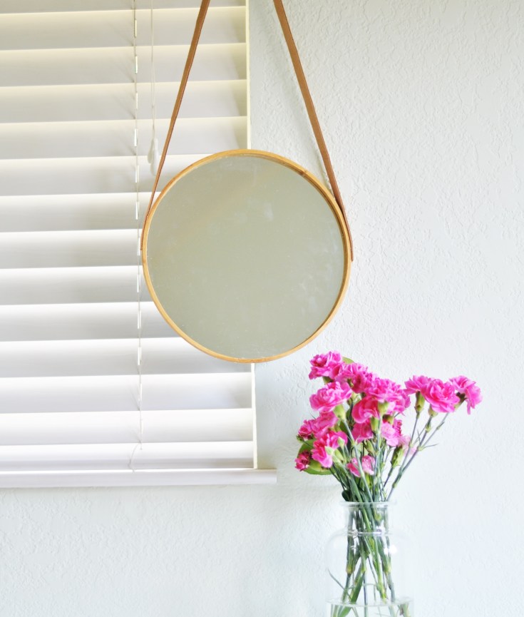 Happy Wednesday! Sorry I skipped posting on Friday – my first missed post this year (I think?), but I will make up for it with an extra post in the future. This weekend I was inspired to create my own hanging mirror based on the popular leather strap mirrors at practically every home store and on Pinterest. This DIY was very simple and cost less than $10! This project can also be easily customized to fit your style.